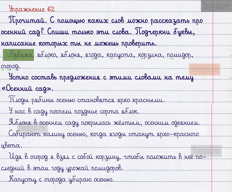 Подробные ответы к 62 заданию учебника по русскому языку авторов Р.Н. Бунеев, Е.В. Бунеева, О.В. Пронина для учащихся 1 класса. §8. Повторяем словарные слова.