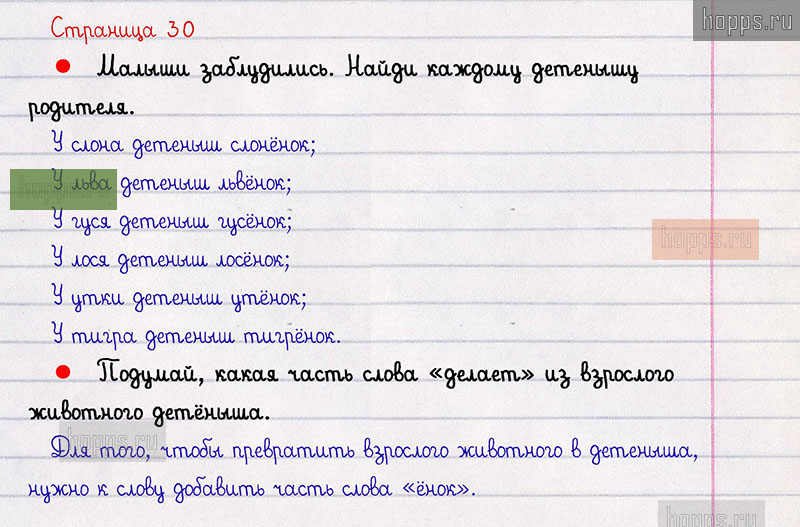 Вопросы и задания: Подумай, какая часть слова «делает» из взрослого животного детёныша.