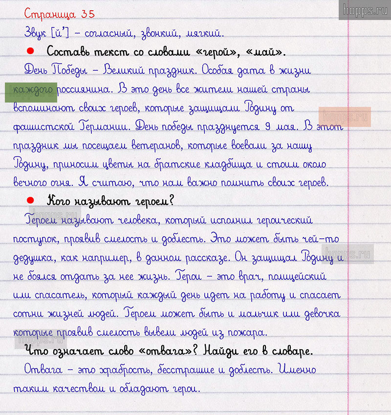 Вопросы и задания: Составь текст со словами герой, май. Кого называют героем? Что означает слово отвага?