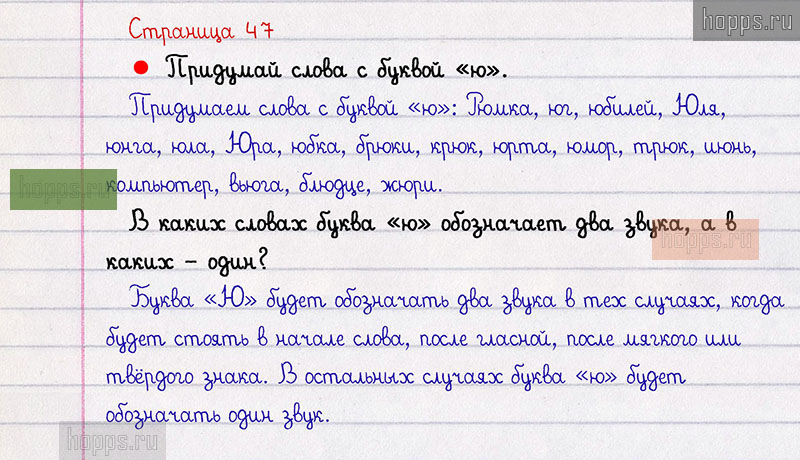 Вопросы и задания: Придумай слова с буквой ю. В каких словах буква ю обозначает два звука, а в каких — один?
