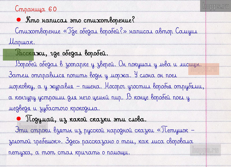Вопросы и задания: Расскажи, где обедал воробей.
