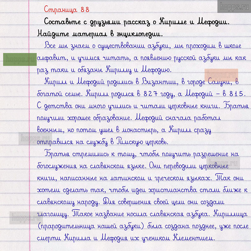 Подробные ответы к заданиям, расположенным на 88 странице 2 части азбуки авторов В.Г. Горецкий, В.А. Кирюшкин, Л.А. Виноградская для учащихся 1 класса.Первоучители словенские. Рассказ о Кирилле и Мефодии для 1 класса.