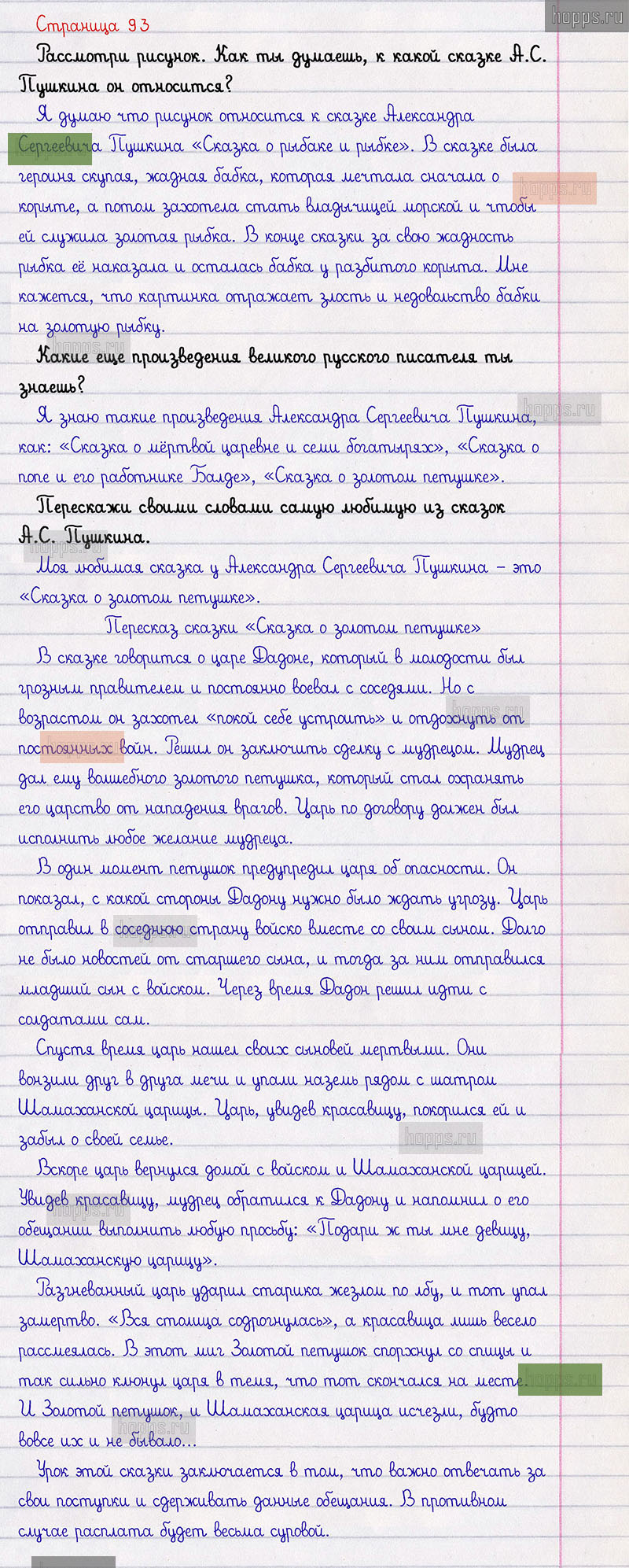 Подробные ответы к заданиям, расположенным на 93 странице 2 части азбуки авторов В.Г. Горецкий, В.А. Кирюшкин, Л.А. Виноградская для учащихся 1 класса.А. С. Пушкин. Пересказ сказки «Сказка о золотом петушке» для 1 класса.