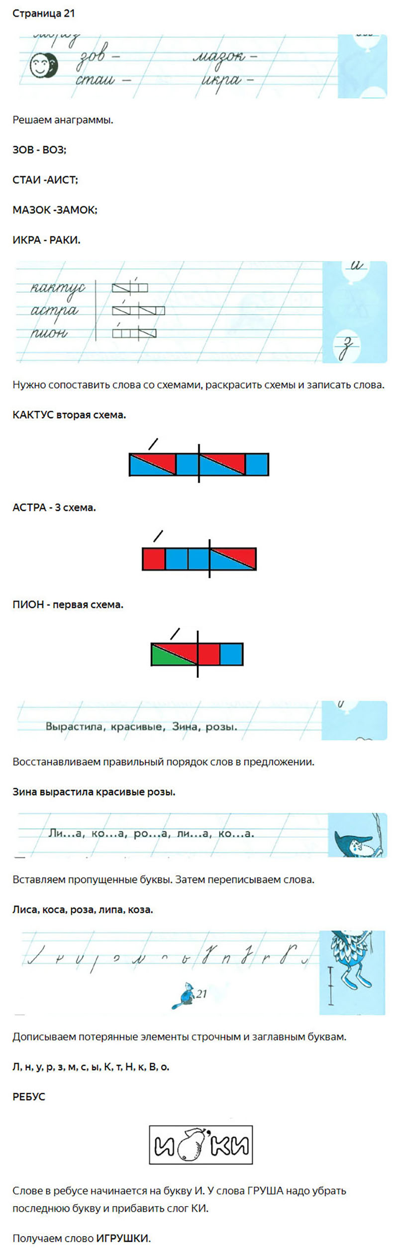 Подробные ответы к заданиям на 21 странице 2 части чудо-прописей автора В.А. Илюхина для учащихся 1 класса.