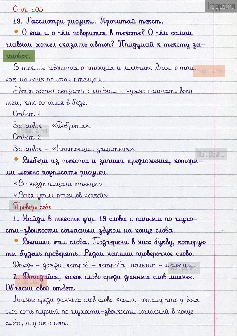 Подробные ответы к вопросам и заданиям, расположенным на 103 странице учебника по русскому языку авторов В.П. Канакина, В.Г. Горецкий для учащихся 1 класса.