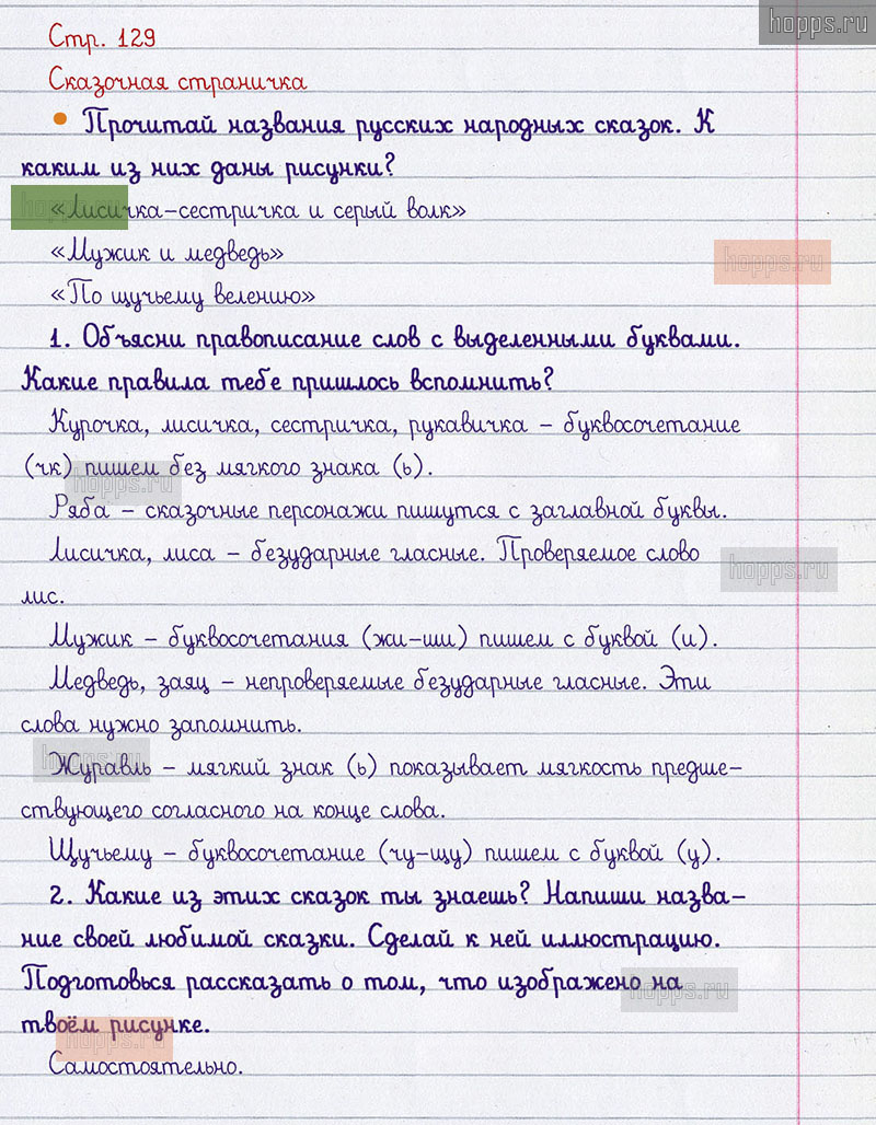 Подробные ответы к вопросам и заданиям, расположенным на 129 странице учебника по русскому языку авторов В.П. Канакина, В.Г. Горецкий для учащихся 1 класса.