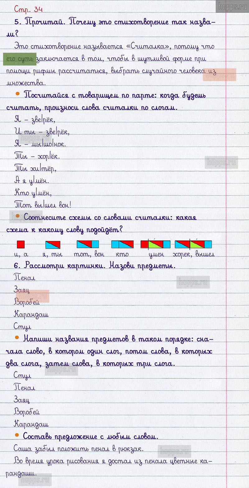 Подробные ответы к вопросам и заданиям, расположенным на 34 странице учебника по русскому языку авторов В.П. Канакина, В.Г. Горецкий для учащихся 1 класса.
