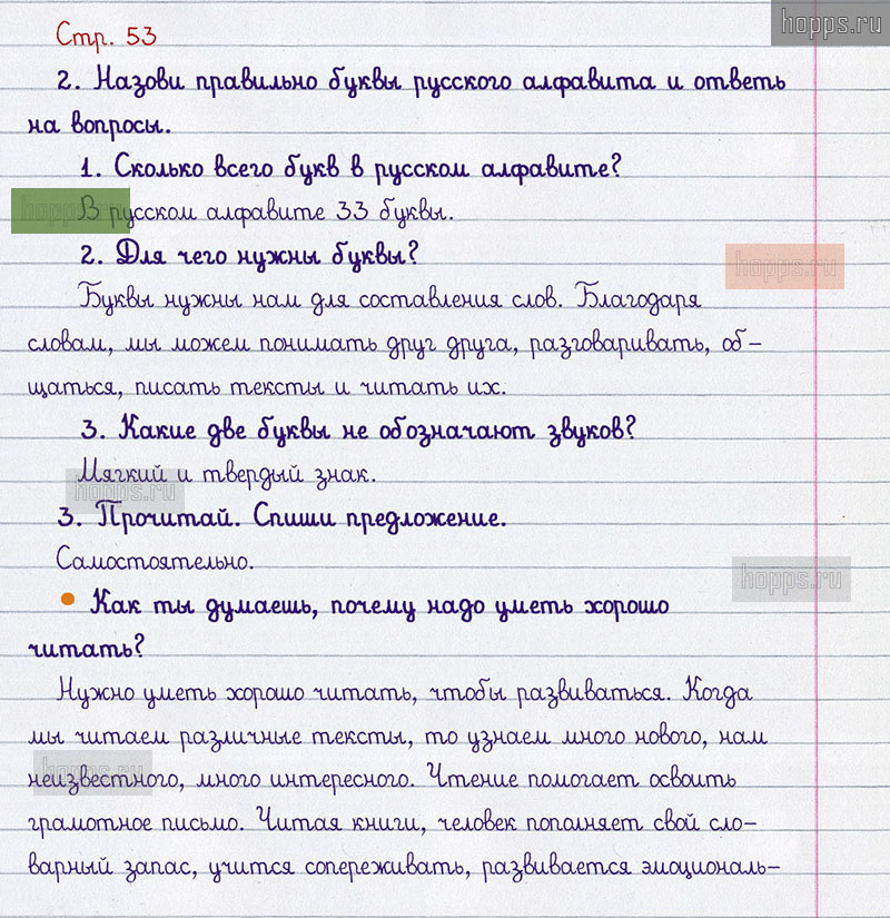 Подробные ответы к вопросам и заданиям, расположенным на 53 странице учебника по русскому языку авторов В.П. Канакина, В.Г. Горецкий для учащихся 1 класса.