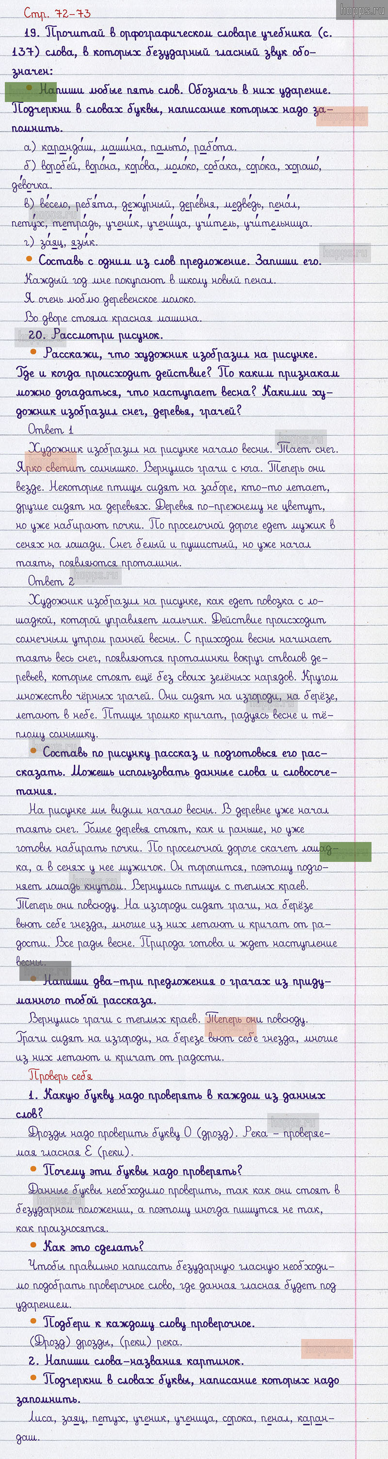 Подробные ответы к вопросам и заданиям, расположенным на 72-73 странице учебника по русскому языку авторов В.П. Канакина, В.Г. Горецкий для учащихся 1 класса.