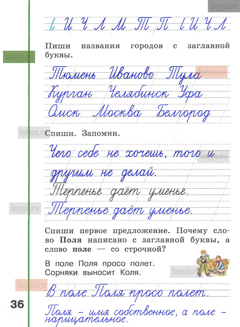 Подробные ответы к заданиям, расположенным на 36 странице рабочей тетради по русскому языку авторов Л.Ф. Климанова, А.В. Абрамов для учащихся 1 класса.