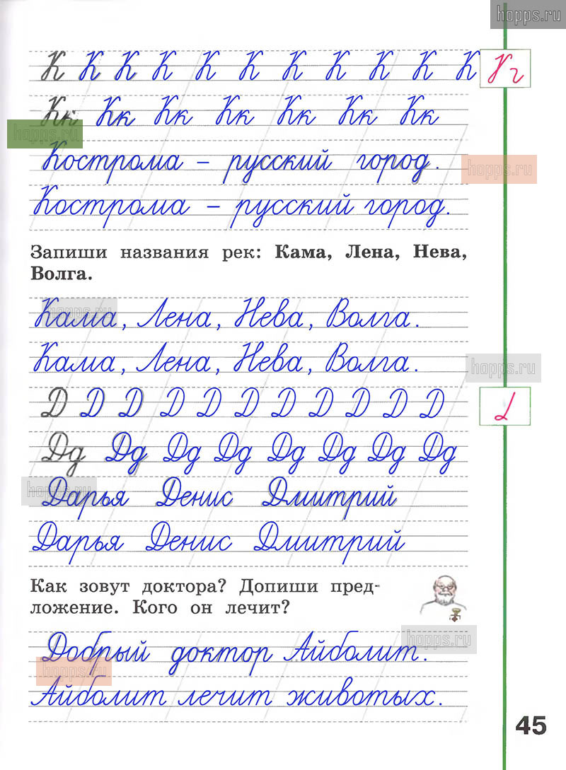 Подробные ответы к заданиям, расположенным на 45 странице рабочей тетради по русскому языку авторов Л.Ф. Климанова, А.В. Абрамов для учащихся 1 класса.