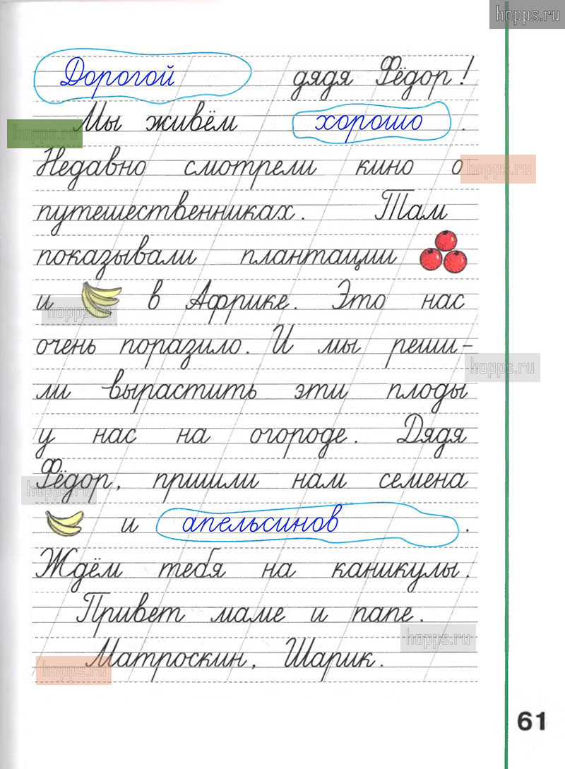 Подробные ответы к заданиям, расположенным на 61 странице рабочей тетради по русскому языку авторов Л.Ф. Климанова, А.В. Абрамов для учащихся 1 класса.