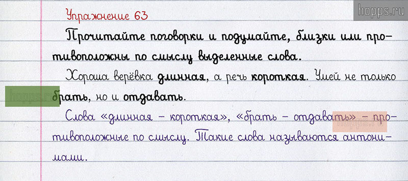 Подробные ответы к 63 упражнению учебника по русскому языку авторов Л.Ф. Климанова, С.Г. Макеева для учащихся 1 класса. Слова и противоположные по значению.