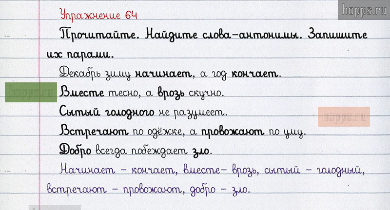Подробные ответы к 64 упражнению учебника по русскому языку авторов Л.Ф. Климанова, С.Г. Макеева для учащихся 1 класса. Слова и противоположные по значению.