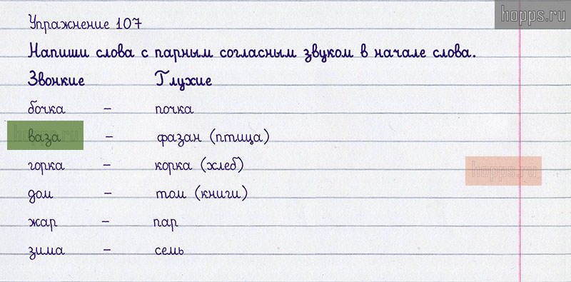 Подробные ответы к 107 упражнению учебника 2020 года по русскому языку автора Т.Г. Рамзаева для учащихся 1 класса. Парные звонкие и глухие согласные звуки. Обозначение парных согласных звуков на конце слова.
