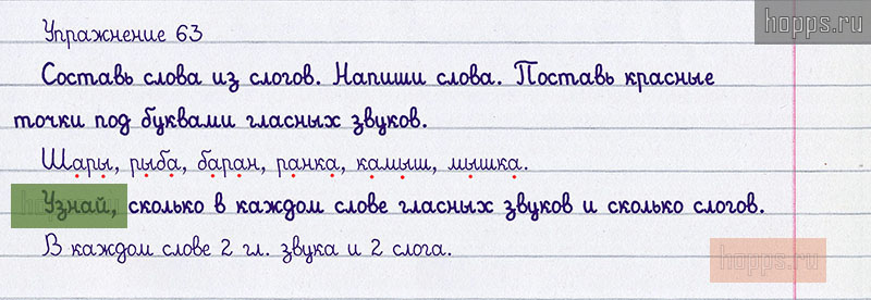 Подробные ответы к 63 упражнению учебника 2020 года по русскому языку автора Т.Г. Рамзаева для учащихся 1 класса. Слово и слог.