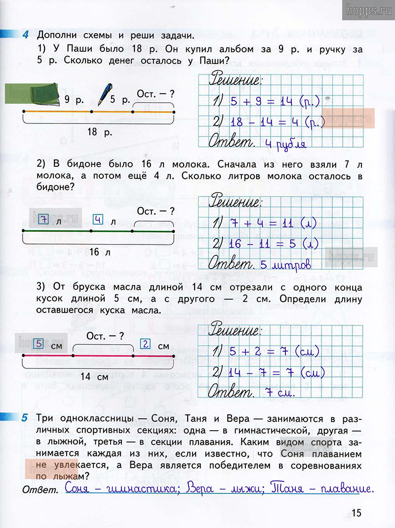 Подробные ответы к заданиям, расположенным на 15 странице 1 части рабочей тетради по математике авторов Г.В. Дорофеев, Т.Н. Миракова, Т.Б. Бука для учащихся 2 класса.