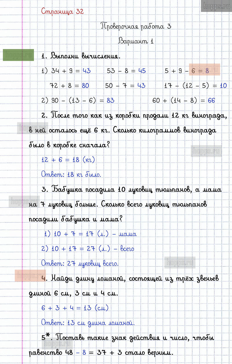 Подробные ответы к заданиям, расположенным на 32 странице проверочных работ по математике авторов С.И. Волкова для учащихся 2 класса. Сложение и вычитание. Проверочная работа 3, вариант 1.