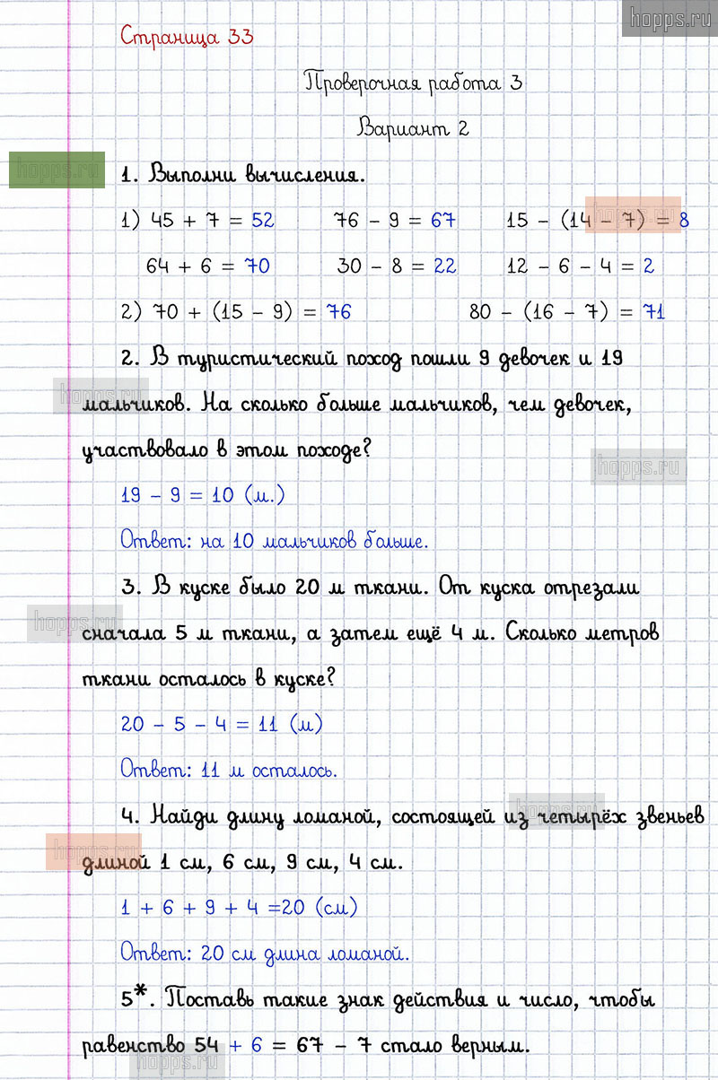 Подробные ответы к заданиям, расположенным на 33 странице проверочных работ по математике авторов С.И. Волкова для учащихся 2 класса. Сложение и вычитание. Проверочная работа 3, вариант 2.