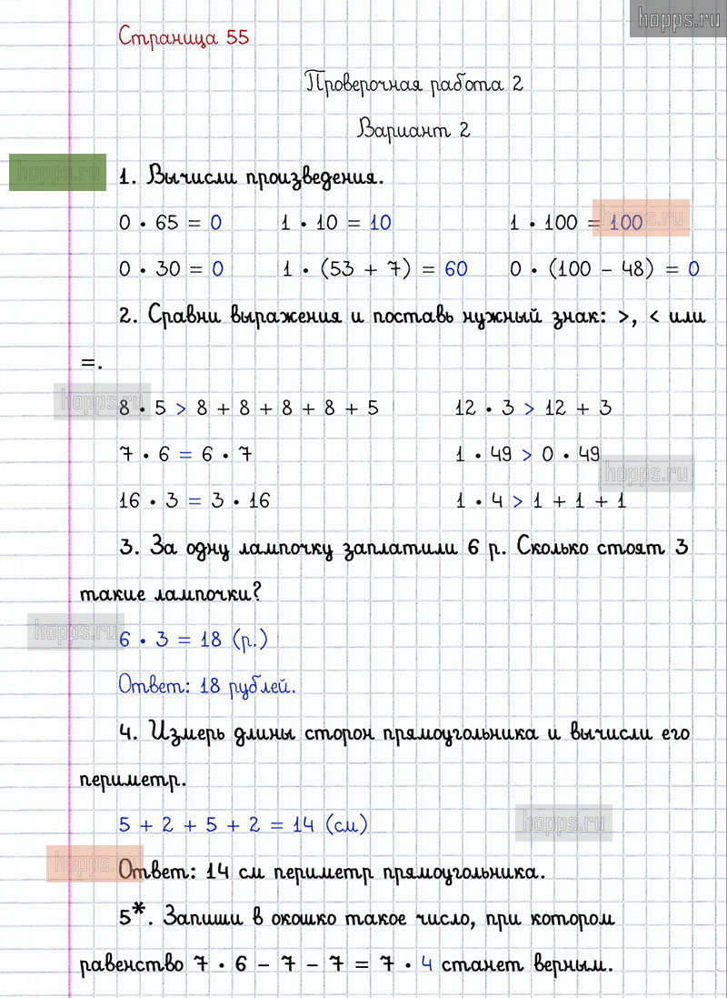 Подробные ответы к заданиям, расположенным на 55 странице проверочных работ по математике авторов С.И. Волкова для учащихся 2 класса. Умножение и деление. Проверочная работа 2, вариант 2.
