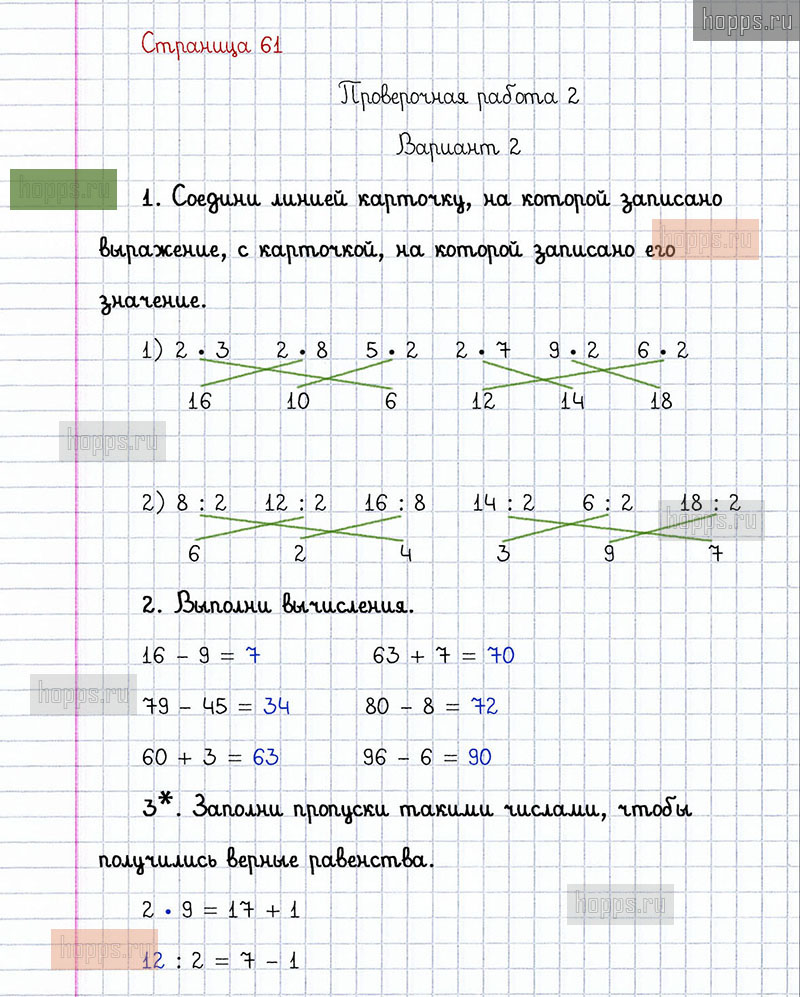 Подробные ответы к заданиям, расположенным на 61 странице проверочных работ по математике авторов С.И. Волкова для учащихся 2 класса. Умножение и деление. Проверочная работа 2, вариант 2.