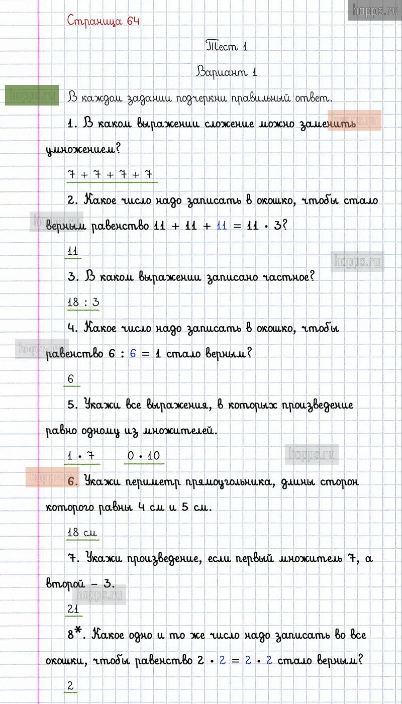 Подробные ответы к заданиям, расположенным на 64 странице проверочных работ по математике авторов С.И. Волкова для учащихся 2 класса. Умножение и деление. Тест 1, вариант 1.