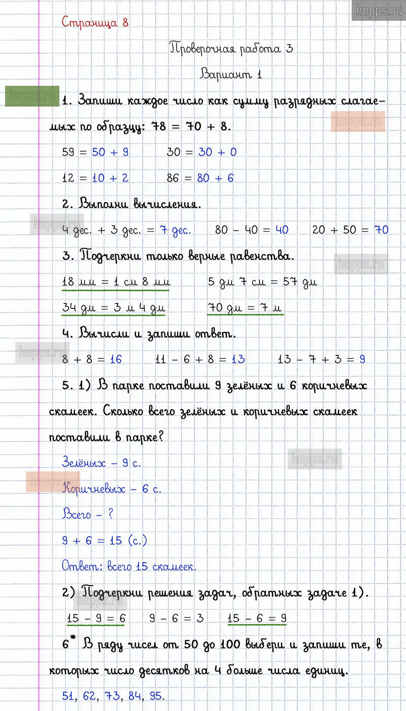 Подробные ответы к заданиям, расположенным на 8 странице проверочных работ по математике авторов С.И. Волкова для учащихся 2 класса. Нумерация. Проверочная работа 3, вариант 1.