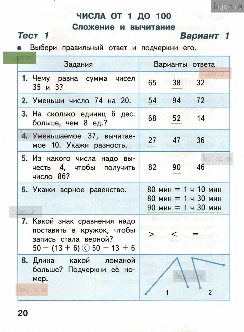 Подробные ответы к заданиям, расположенным на 20 странице тестов по математике автора С.И. Волкова для учащихся 2 класса.