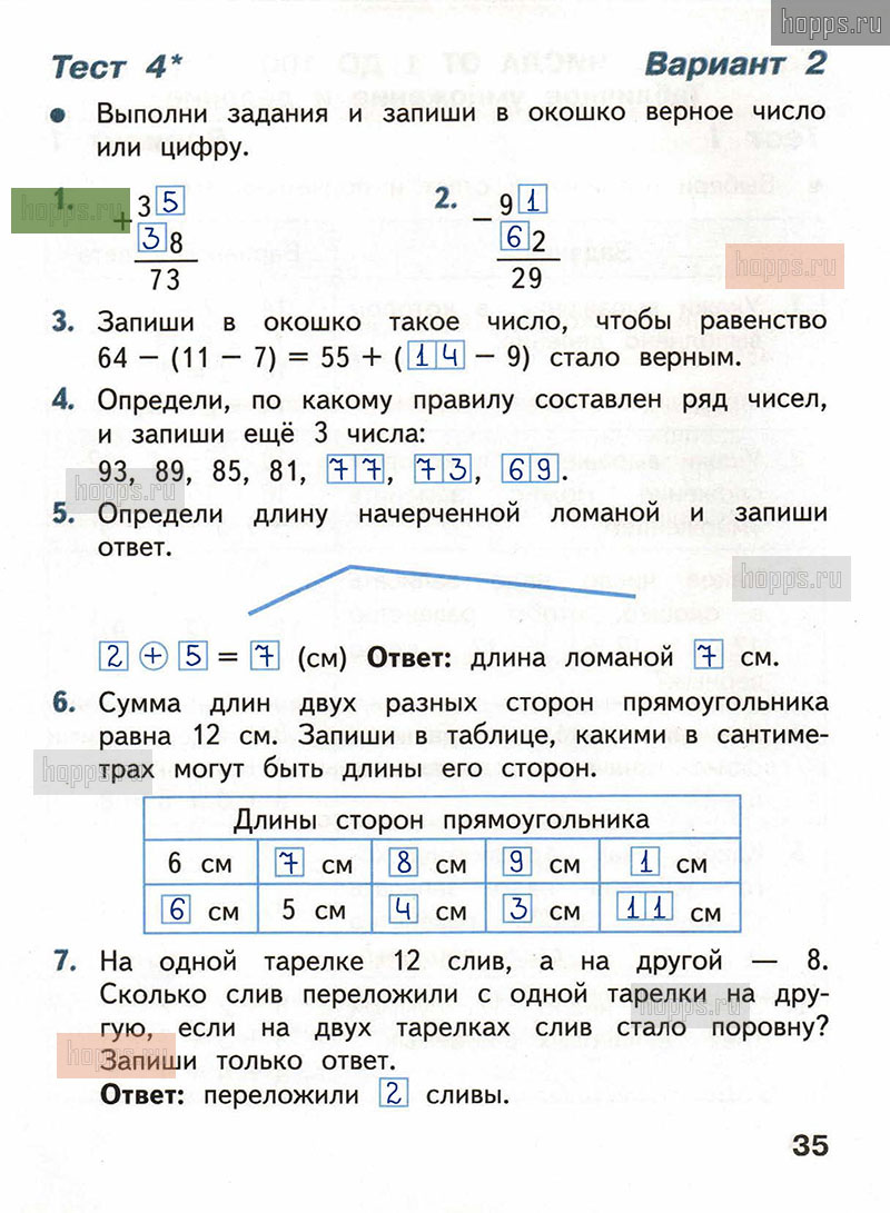 Подробные ответы к заданиям, расположенным на 35 странице тестов по математике автора С.И. Волкова для учащихся 2 класса.