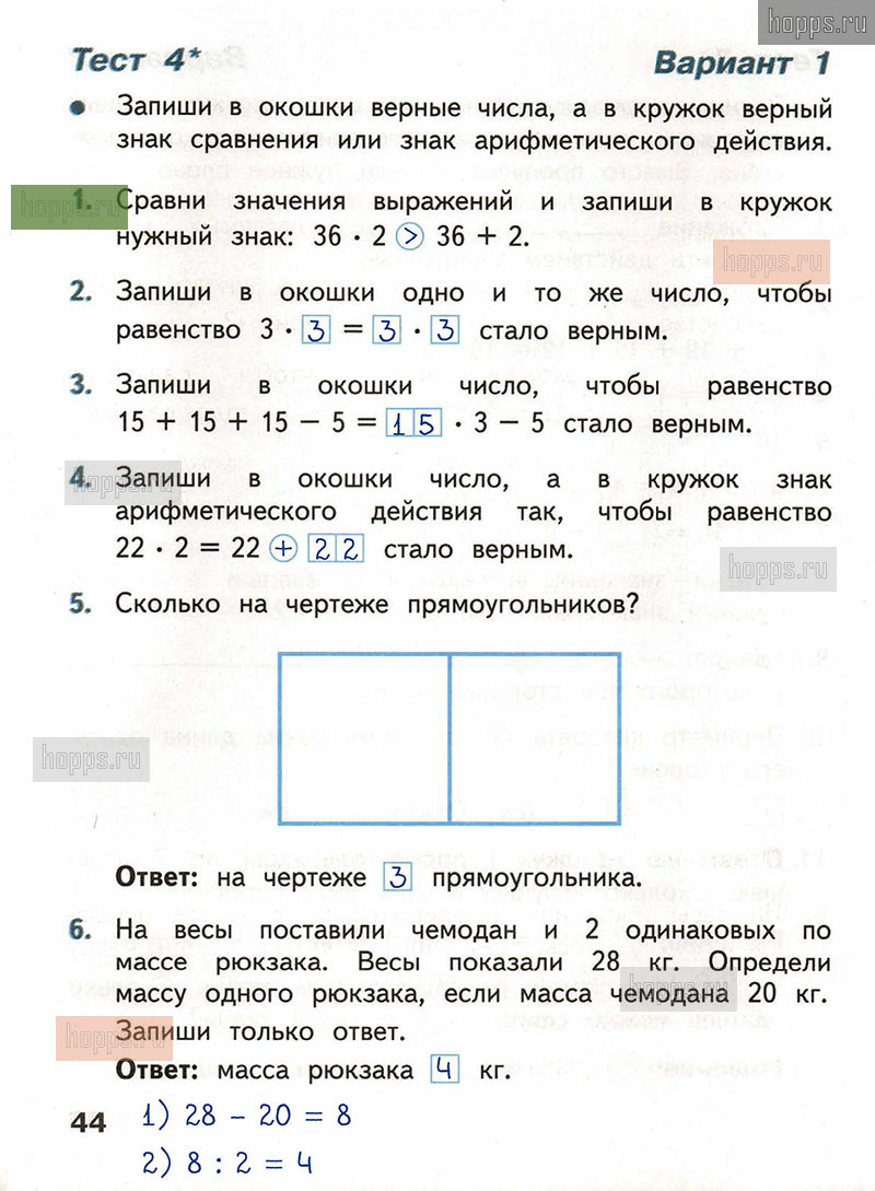 Подробные ответы к заданиям, расположенным на 44 странице тестов по математике автора С.И. Волкова для учащихся 2 класса.