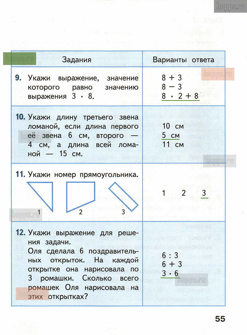 Подробные ответы к заданиям, расположенным на 55 странице тестов по математике автора С.И. Волкова для учащихся 2 класса.