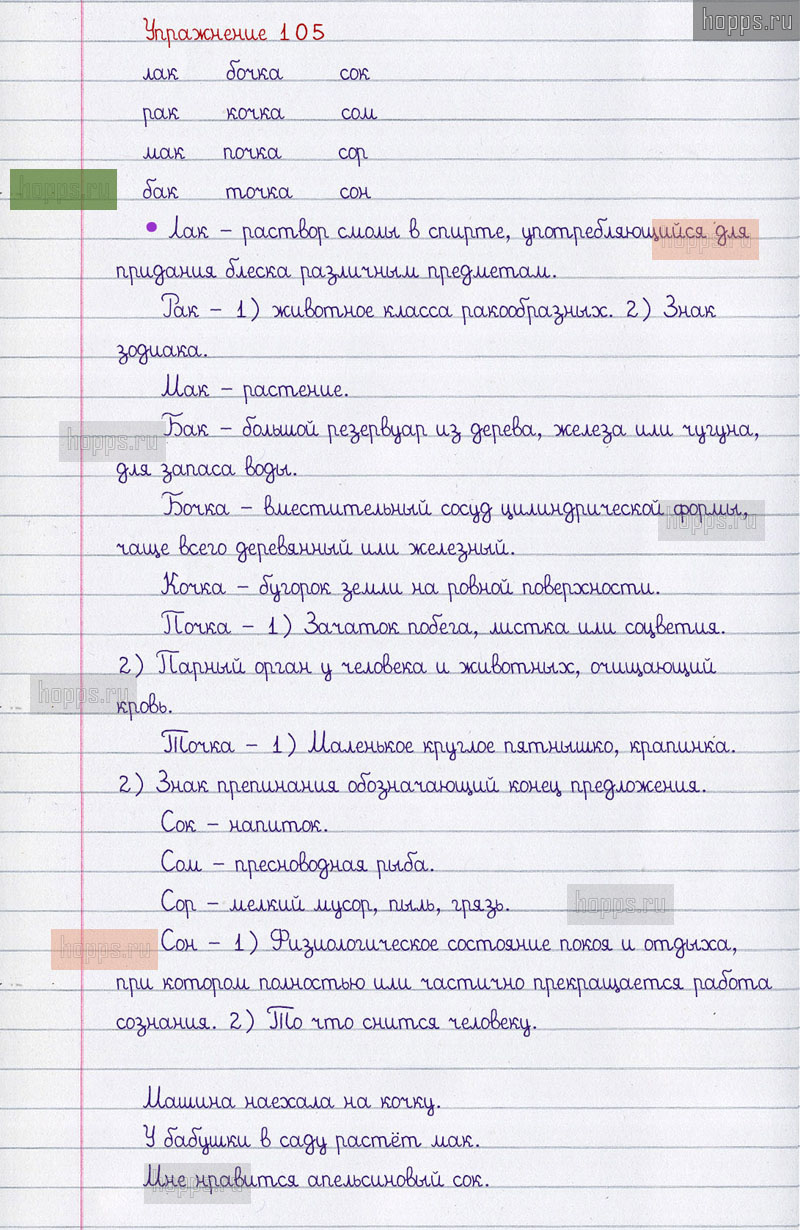 Готовые ответы к 105 упражнению 1 части рабочей тетради по русскому языку автора В.П. Канакина для учащихся 2 класса, 2019 г.
