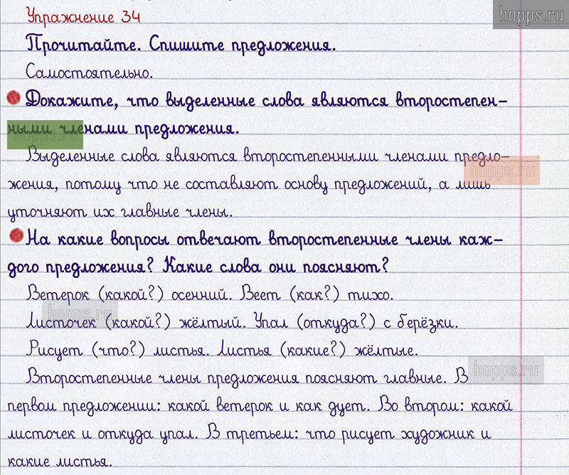 Подробные ответы к 34 упражнению 1 части учебника по русскому языку авторов В.П. Канакина, В.Г. Горецкий для учащихся 2 класса. Члены предложения.