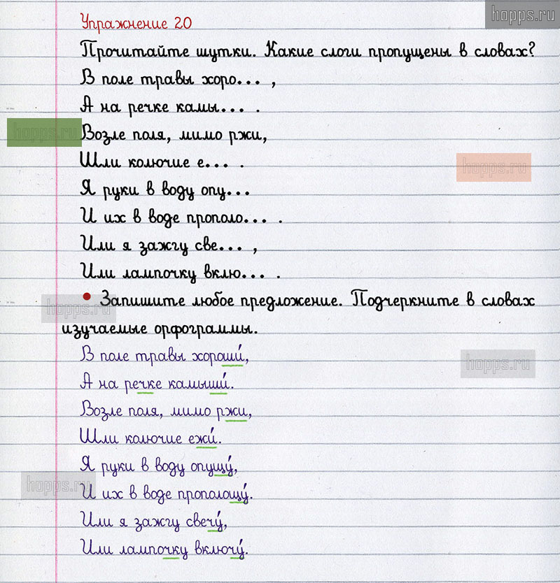 Подробные ответы к 20 упражнению 2 части учебника по русскому языку авторов В.П. Канакина, В.Г. Горецкий для учащихся 2 класса. Правописание буквосочетаний с шипящими звуками.