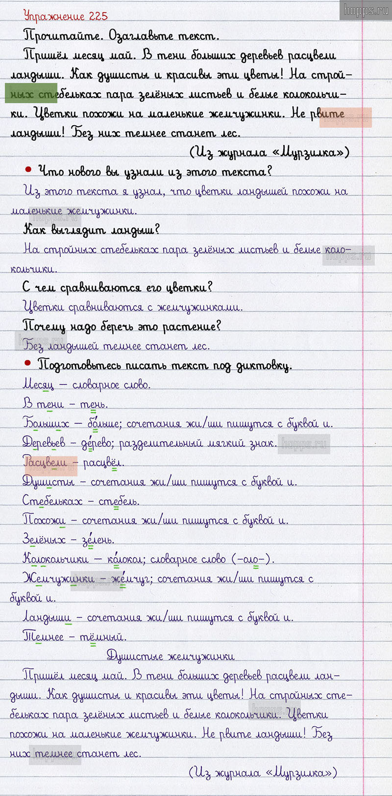 Подробные ответы к 225 упражнению 2 части учебника по русскому языку авторов В.П. Канакина, В.Г. Горецкий для учащихся 2 класса. Повторение.