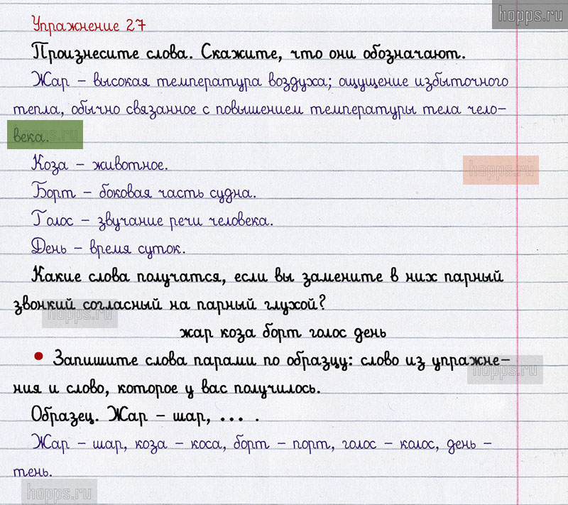 Подробные ответы к 27 упражнению 2 части учебника по русскому языку авторов В.П. Канакина, В.Г. Горецкий для учащихся 2 класса. Звонкие и глухие согласные звуки.
