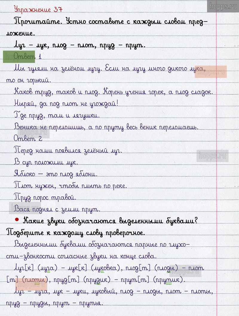 Подробные ответы к 37 упражнению 2 части учебника по русскому языку авторов В.П. Канакина, В.Г. Горецкий для учащихся 2 класса. Звонкие и глухие согласные звуки.