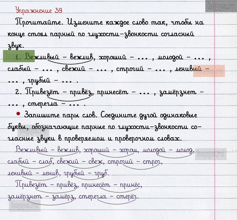 Подробные ответы к 39 упражнению 2 части учебника по русскому языку авторов В.П. Канакина, В.Г. Горецкий для учащихся 2 класса. Звонкие и глухие согласные звуки.