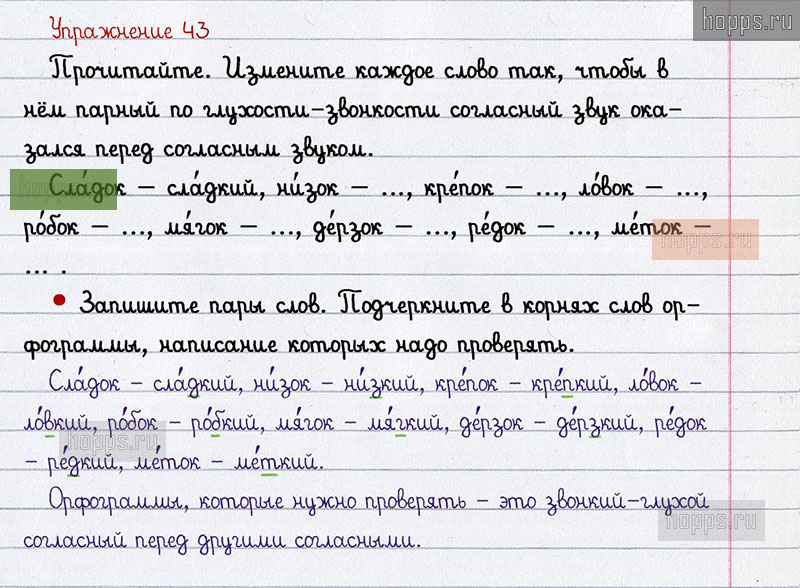 Подробные ответы к 43 упражнению 2 части учебника по русскому языку авторов В.П. Канакина, В.Г. Горецкий для учащихся 2 класса. Звонкие и глухие согласные звуки.