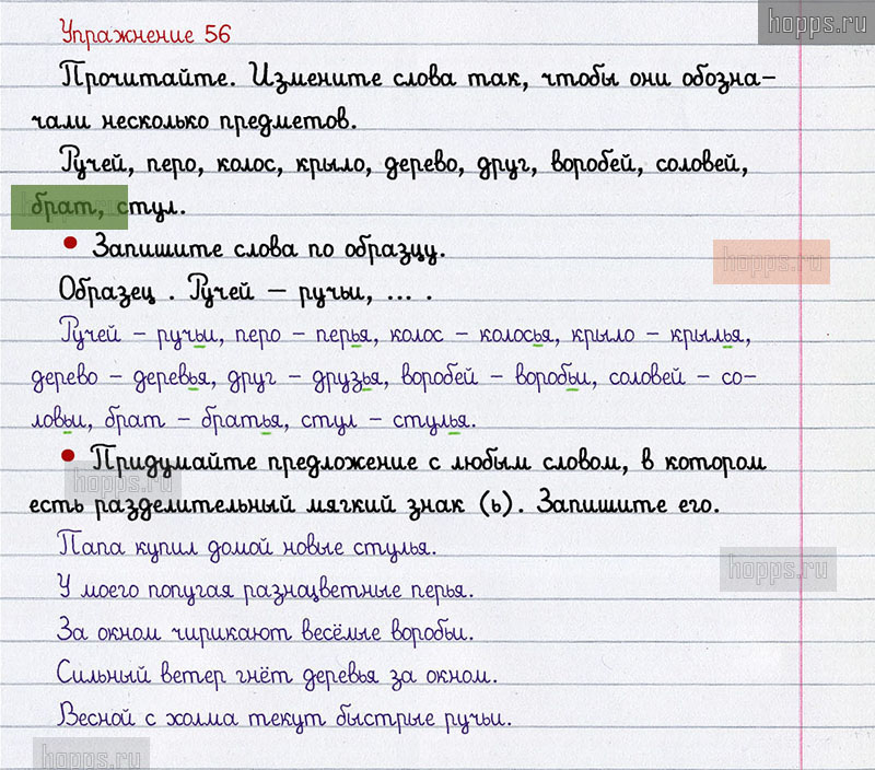 Подробные ответы к 56 упражнению 2 части учебника по русскому языку авторов В.П. Канакина, В.Г. Горецкий для учащихся 2 класса. Разделительный мягкий знак (ь).