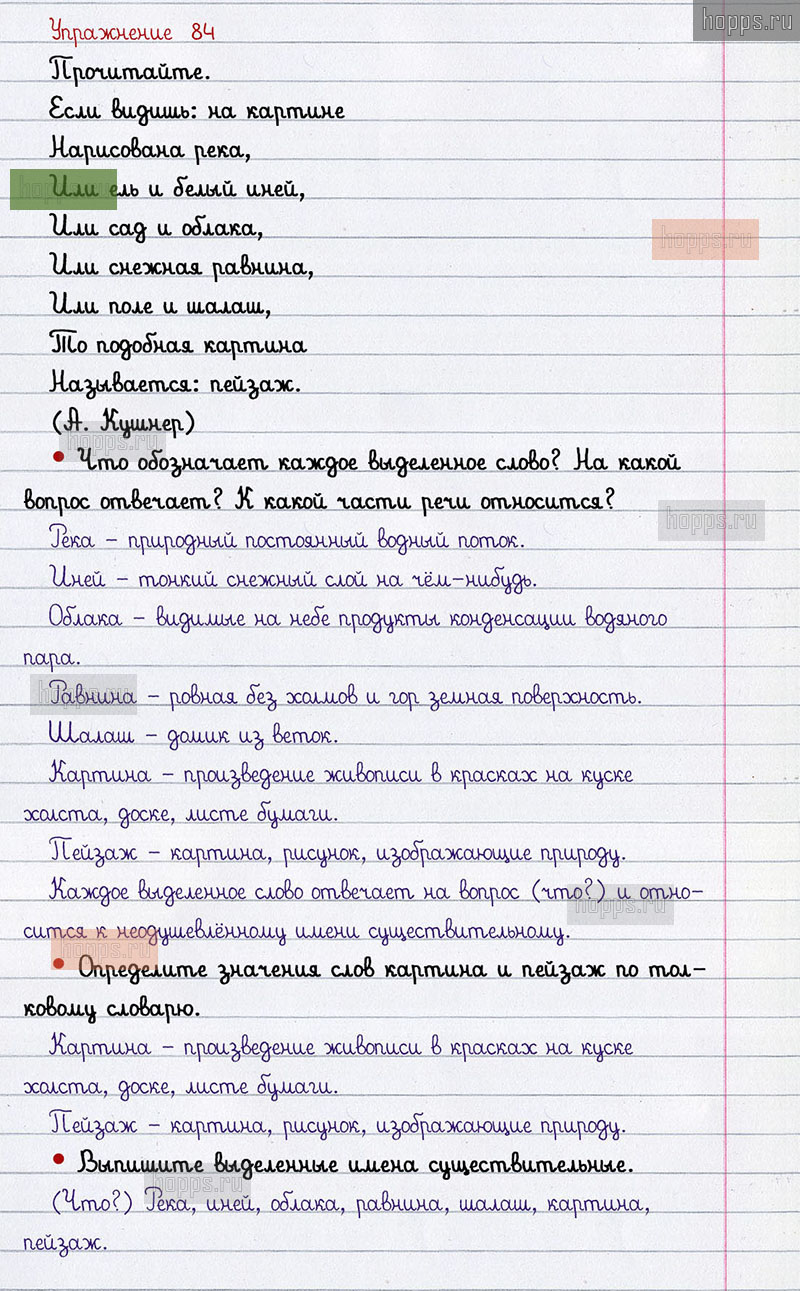 Подробные ответы к 84 упражнению 2 части учебника по русскому языку авторов В.П. Канакина, В.Г. Горецкий для учащихся 2 класса. Имя существительное.