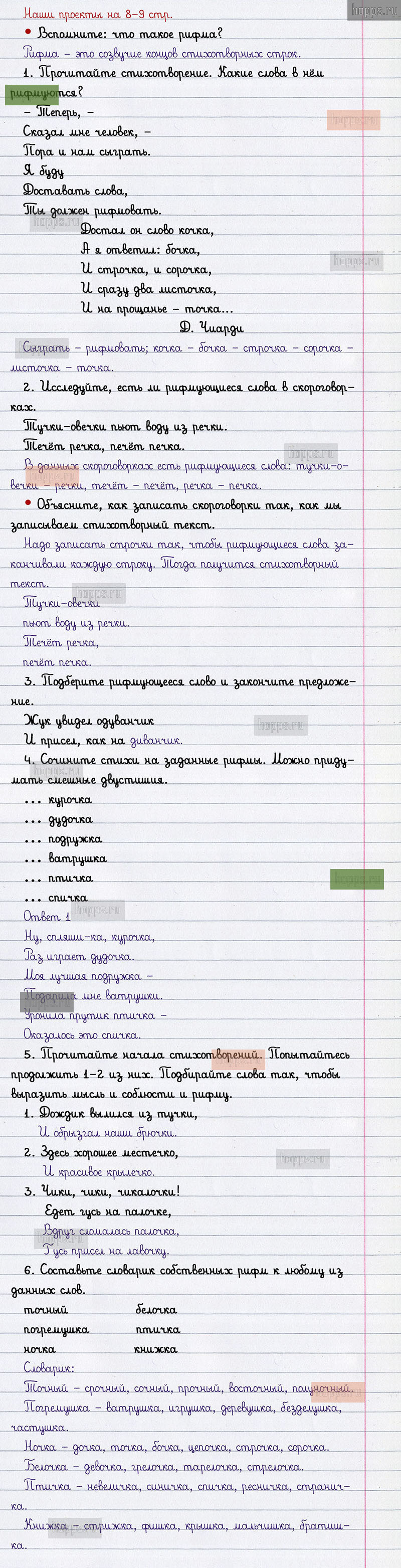 Подробные ответы к заданиям наши проекты на 8-9 странице 2 части учебника по русскому языку авторов В.П. Канакина, В.Г. Горецкий для учащихся 2 класса.