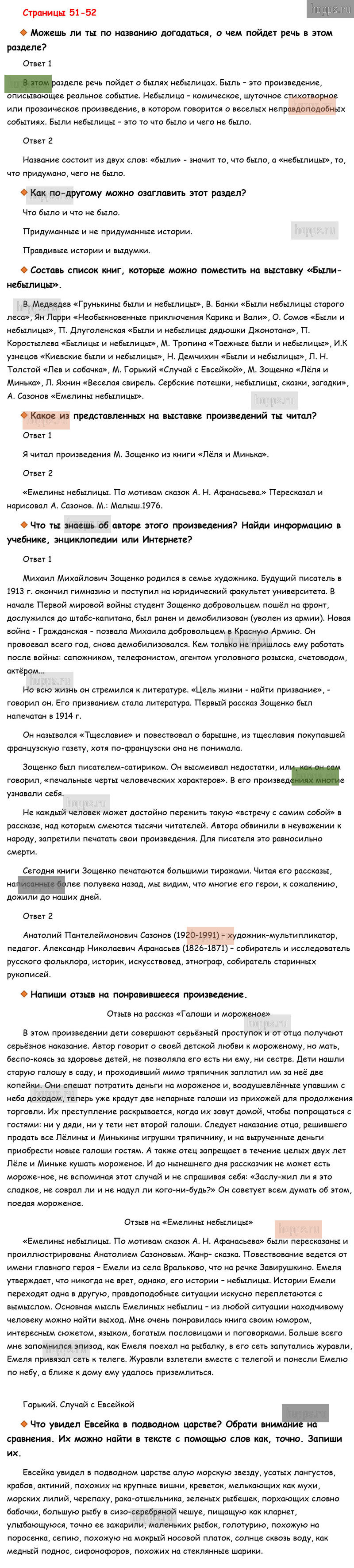 Готовые ответы к вопросам и заданиям на 51-52 странице рабочей тетради по литературному чтению для учащихся 3 класса, авторов М.В. Бойкина, Л.А. Виноградская, Школа России, 2019 г.