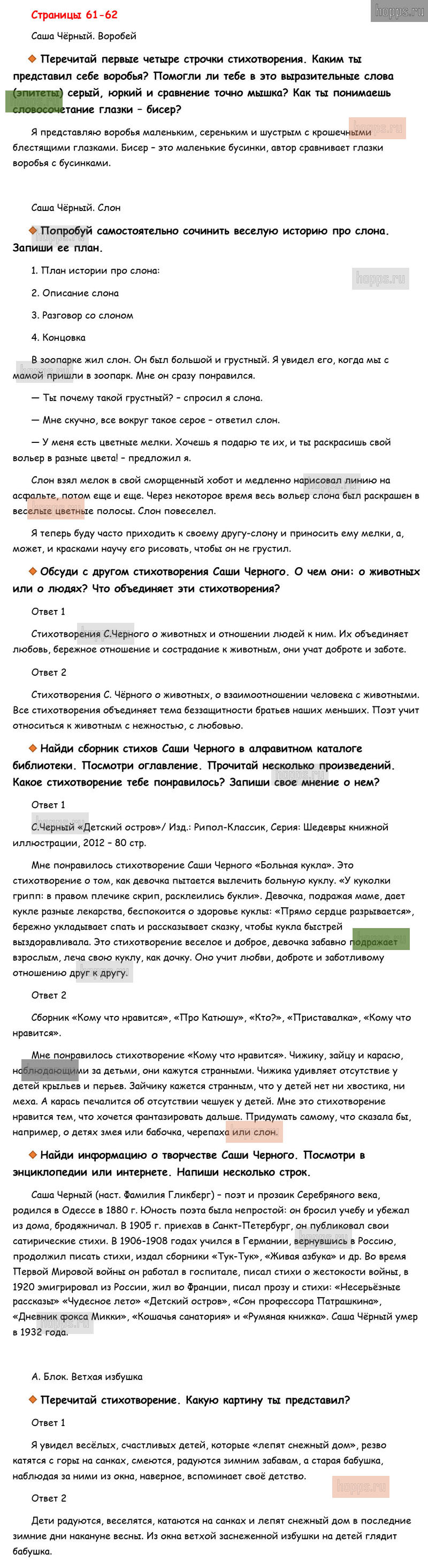 Готовые ответы к вопросам и заданиям на 61-62 странице рабочей тетради по литературному чтению для учащихся 3 класса, авторов М.В. Бойкина, Л.А. Виноградская, Школа России, 2019 г.