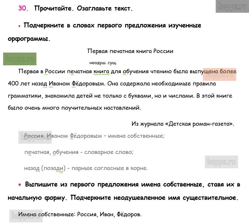 Готовые ответы к 30 упражнению 2 части рабочей тетради по русскому языку для учащихся 3 класса, автора В.П. Канакина, Школа России, 2019 г.