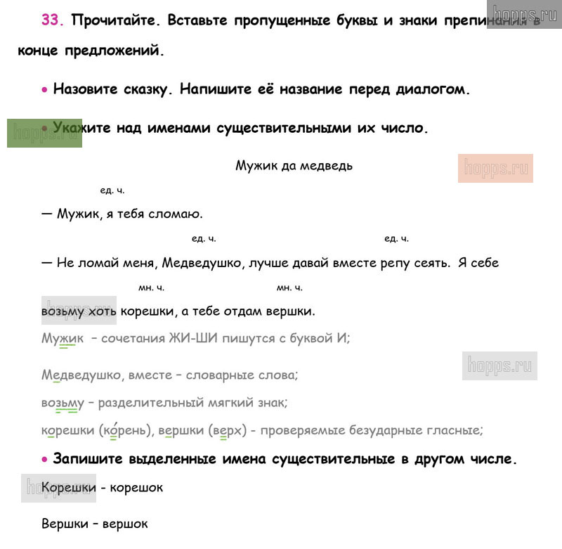 Готовые ответы к 33 упражнению 2 части рабочей тетради по русскому языку для учащихся 3 класса, автора В.П. Канакина, Школа России, 2019 г.