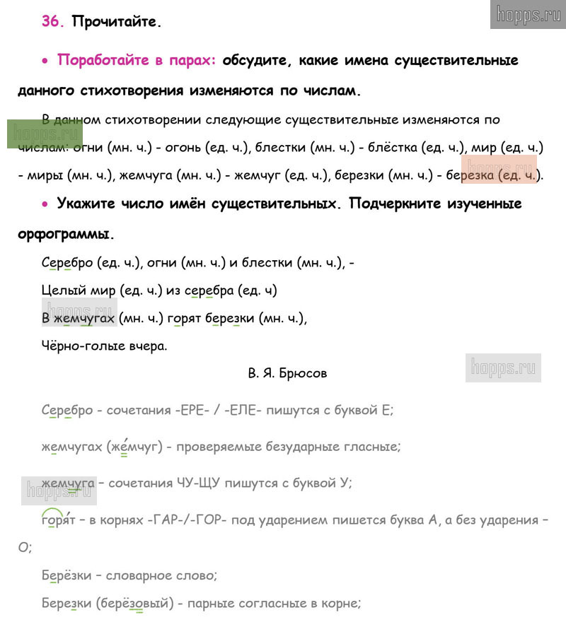Готовые ответы к 36 упражнению 2 части рабочей тетради по русскому языку для учащихся 3 класса, автора В.П. Канакина, Школа России, 2019 г.