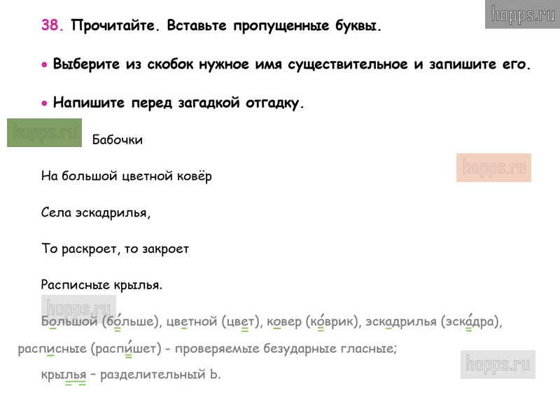 Готовые ответы к 38 упражнению 2 части рабочей тетради по русскому языку для учащихся 3 класса, автора В.П. Канакина, Школа России, 2019 г.