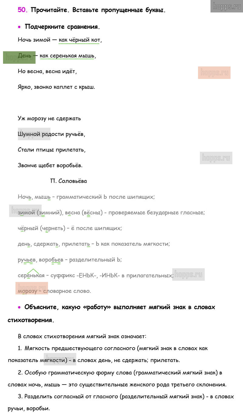 Готовые ответы к 50 упражнению 2 части рабочей тетради по русскому языку для учащихся 3 класса, автора В.П. Канакина, Школа России, 2019 г.