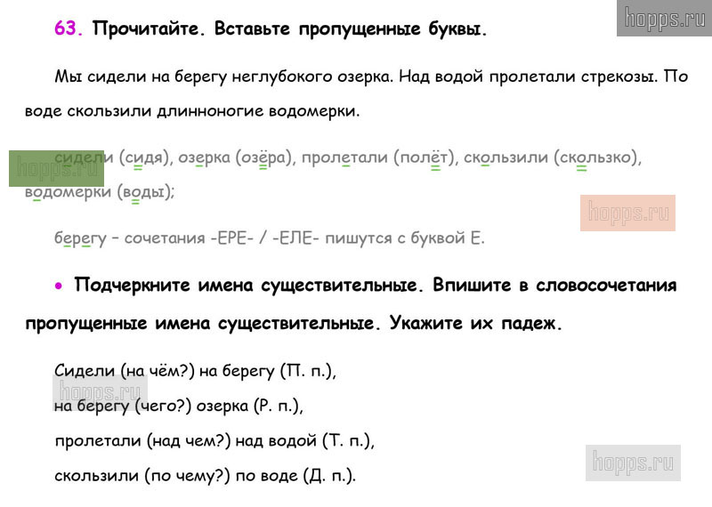 Готовые ответы к 63 упражнению 2 части рабочей тетради по русскому языку для учащихся 3 класса, автора В.П. Канакина, Школа России, 2019 г.